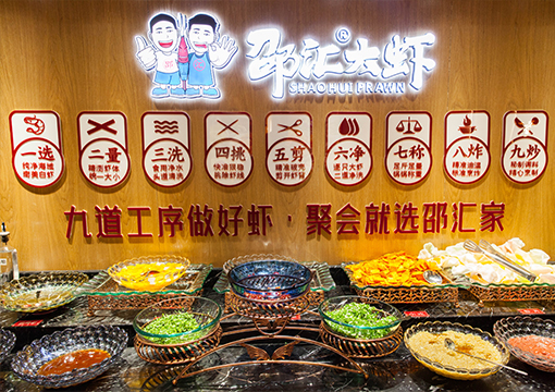 邵匯大蝦擁有強(qiáng)大的后勤保障部門,核心底料由公司中央工廠集中配送,食材精選進(jìn)口大蝦,搭配秘制底料制作而成,研發(fā)出一鍋兩吃的飲食模式(先吃蝦后涮菜,葷素搭配隨心選),打造出綠色健康的飲食新文化。